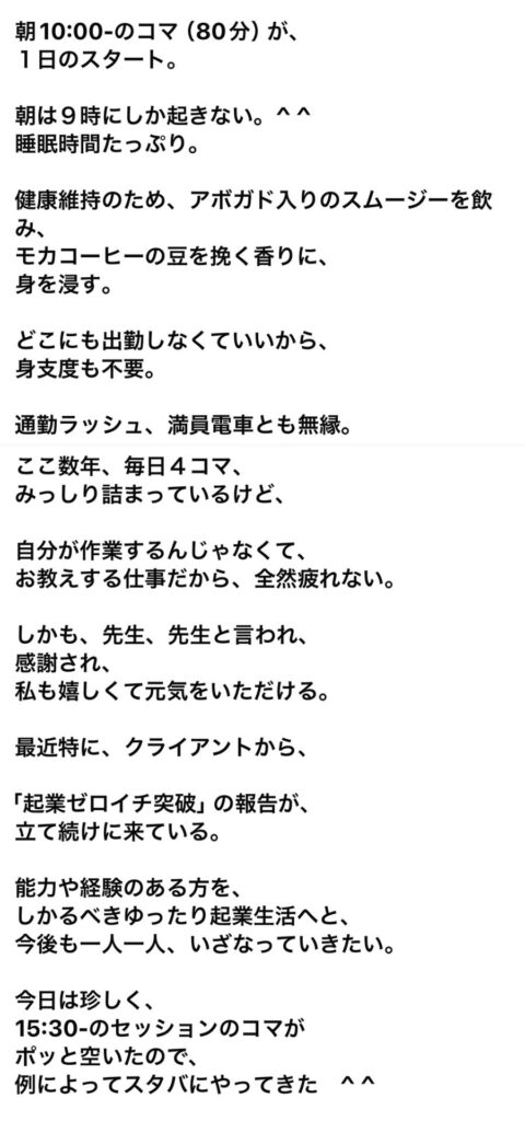 (自宅から全国にセッション、 週30時間労働、ストレス小、4日に1回程度スタバで読書)