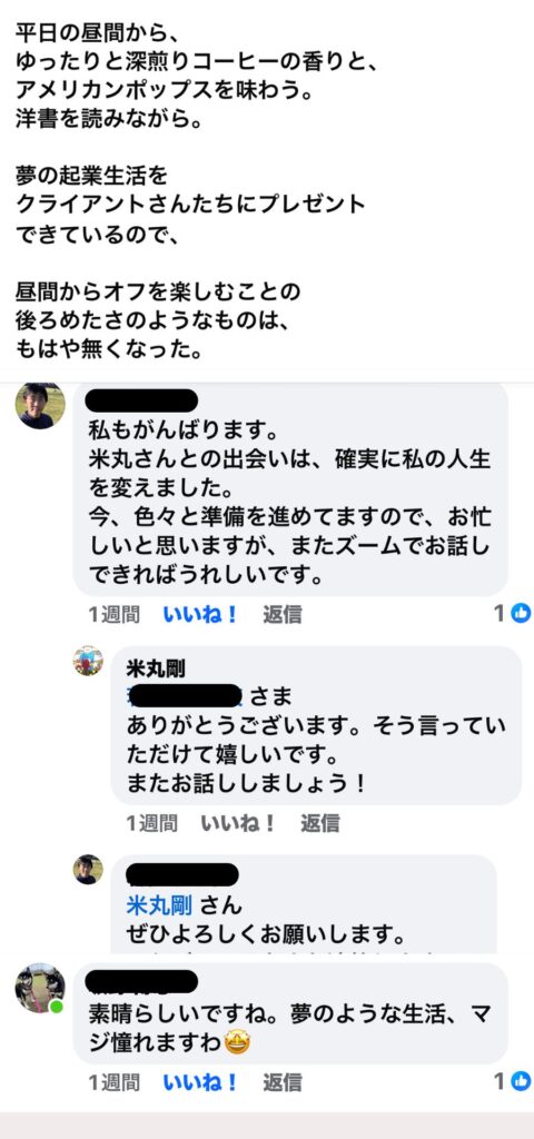 年金生活を前に、起業及び集客安定化を目指して、米丸様のサポートを受けました。